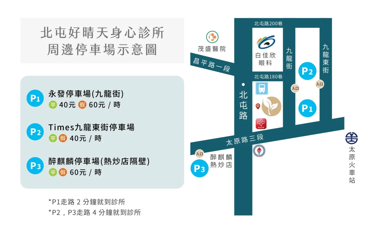 北屯好晴天身心診所是位於台中北屯路的身心科診所,近西區、北區、北屯,74號文心北屯交流道下來5分鐘車程,台中交流道交流道下來15分鐘車程,捷運四維國小站出站步行10分鐘,診所門口即有公車站牌直達,附近即有收費停車場,交通及停車非常便利。