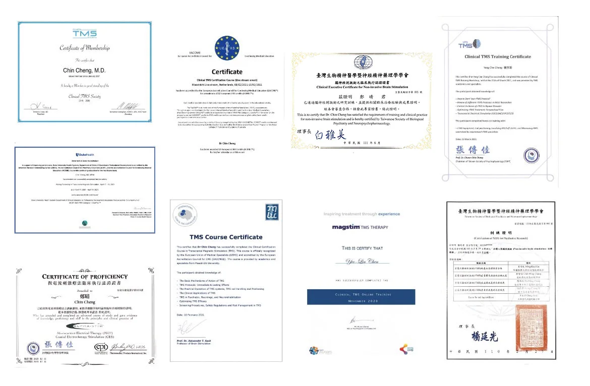 ✅團隊所有醫師,均有台灣生物精神醫學會、台灣臨床 TMS 腦刺激學會或其他多項國內外 TMS 訓練認證,部分醫師有台灣生物精神醫學會之腦神經刺激術專家證書。