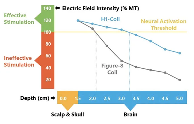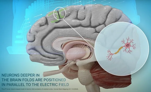 另一方面,因位於大腦皮質皺褶較深處的神經元與電流平行,而與電流平行的神經元對於電刺激會更敏感,因此刺激這些較深的神經元可能會有較佳的憂鬱症治療療效。