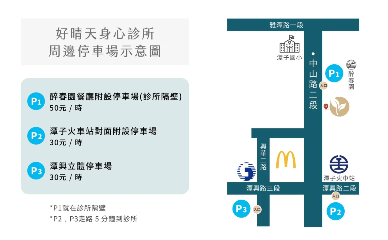 好晴天身心診所是位於台中潭子火車站旁的身心科診所,火車站出站步行3分鐘,近北屯、大雅、豐原、西屯、神岡,74號潭子交流道下來5分鐘車程。 隔壁即有餐廳收費停車場,火車站對面有公有停車場,交通及停車非常便利。